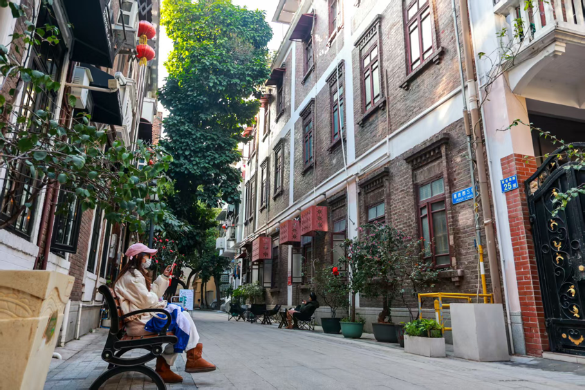 行走在惠吉西,扑面先是一股“老广”的烟火气息,树荫下老人摇扇闲聊,广场上孩子追着球跑。红砖绿瓦映着窗台绿植,别有一番趣致。空气中还混着咖啡的香气与年轻人的欢笑声,老巷瞬间鲜活,叫人不由放慢脚步,慢悠悠地逛,这里一处雅致小庭院,那里一间文艺小店,既好玩又出片。