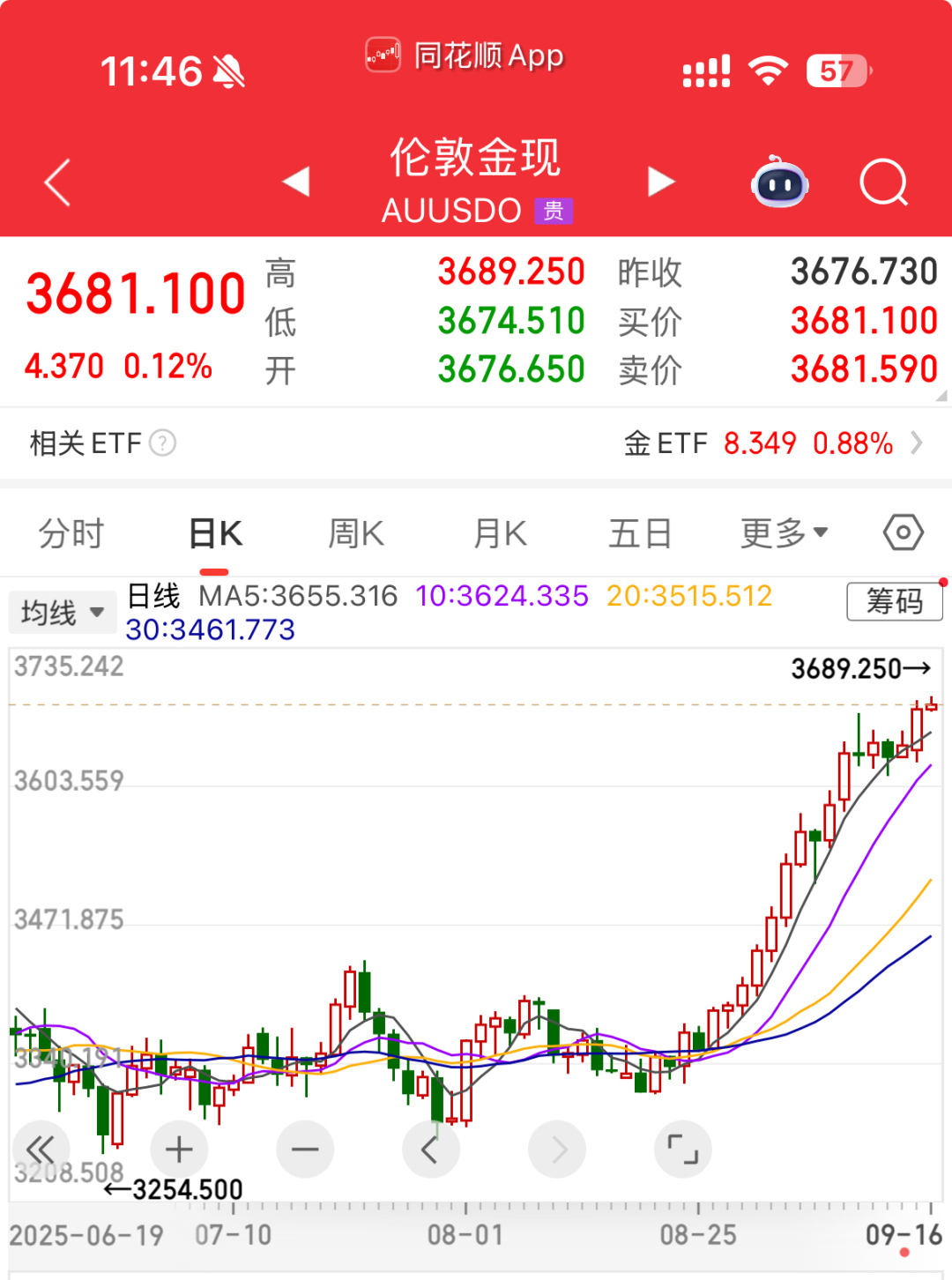 现货黄金升至每盎司3685美元上方,再创纪录新高。截至发稿,伦敦金现高位报3689.25美元/盎司,历史首次站上3680美元/盎司。同时,COMEX黄金也拉涨近1%,高位报3728.4美元/盎司,创出3720美元/盎司的历史新高。