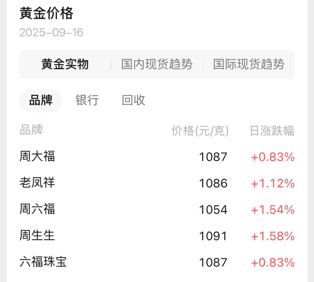9月16日,受国际金价续创新高影响,国内多家品牌金饰价格再度攀升,但涨跌幅度较大。其中,周生生足金饰品价格一举突破每克1090元。截至发稿,周生生报价每克1091元,日内涨幅1.58%。