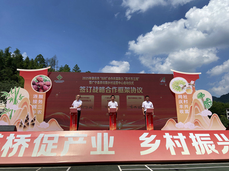 仪式现场围绕“社村”合作主线,通过签约、发布等环节,进一步完善产业协同网络,释放共富活力。广宁县赤成农业发展有限公司与10家企业签订农产品购销合作协议,以“订单”为农户收入保驾护航,购销总金额达1015.05万元。