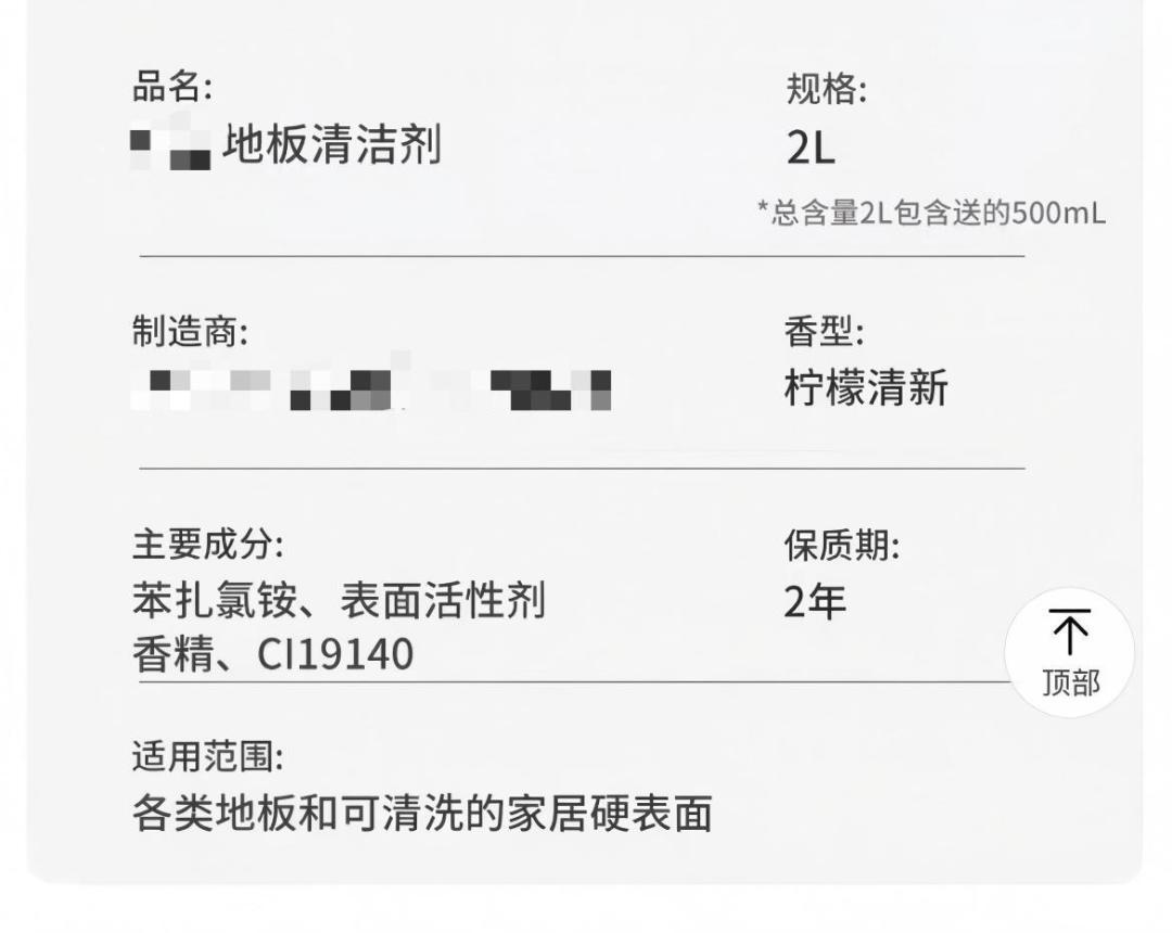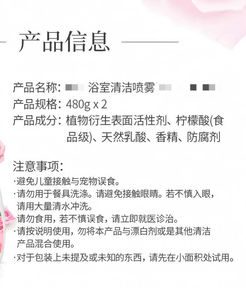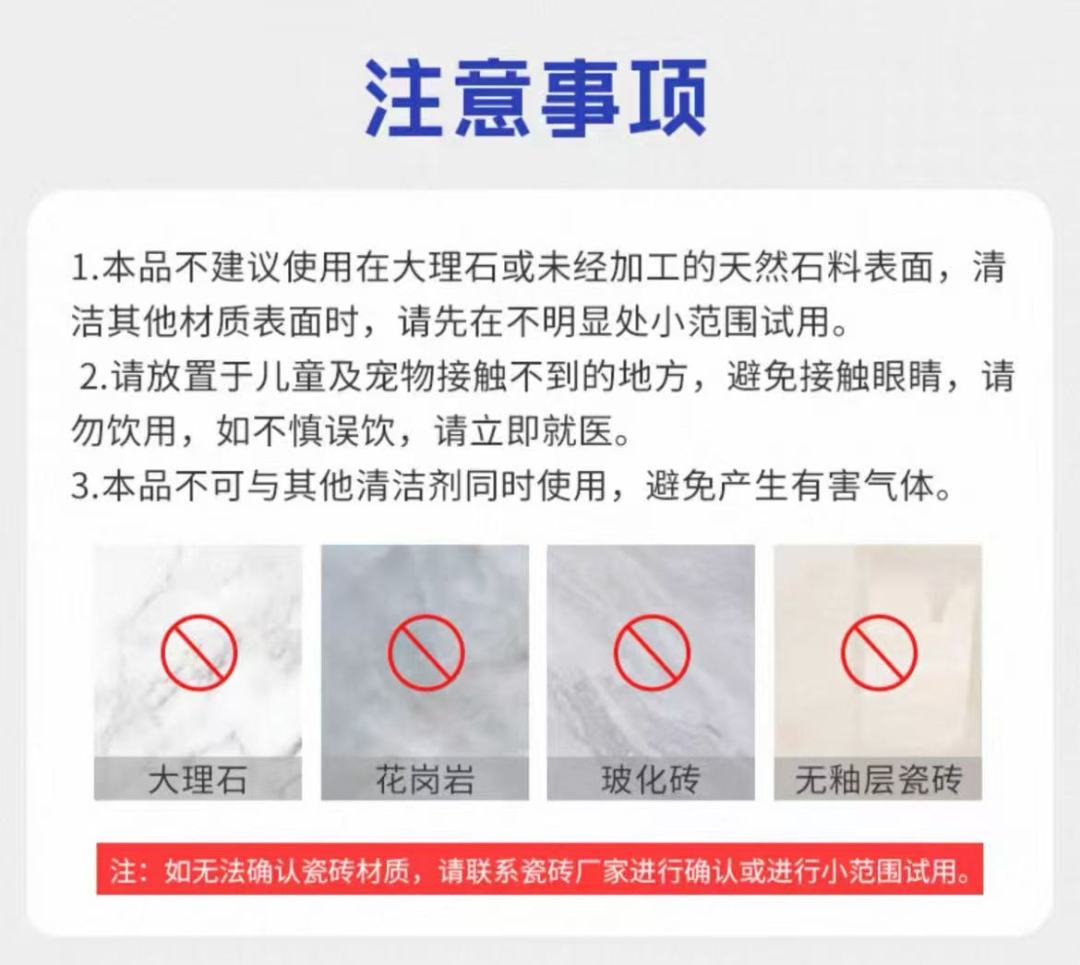 同时大多数的商品详情页标注了适用的材质、避免接触眼睛、避免饮用、避免与其他清洁剂同时使用等。