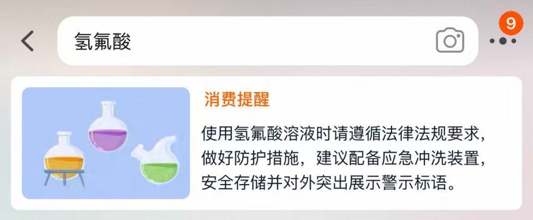 9月16日晚,记者再搜索“氢氟酸”时,电商平台出现了“消费提醒”。