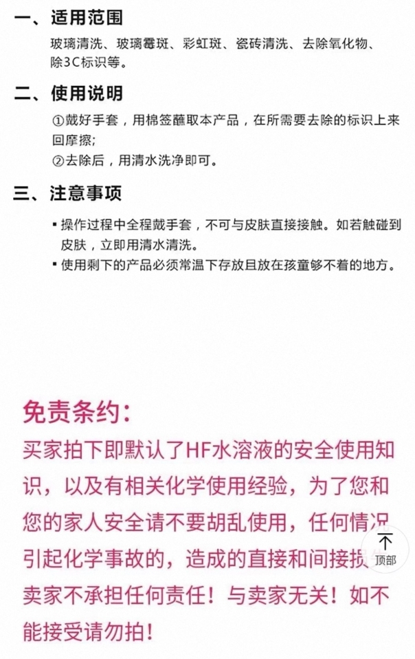 而在商品页面上,不少商家提及其功能,写有“清洗玻璃霉斑、彩虹斑、去除玻璃3C标志”等宣传语,但在页面内介绍产品时却仅说明“戴好手套、棉签蘸取;不可与皮肤直接接触,如若接触到皮肤,立即用清水清洗。”但并未提及要在通风、戴安全面罩的情况下使用,也并未提及剩余试剂的保存问题;同时注明免责条约“买家拍下即默认使用常识和化学使用经验”等内容。
