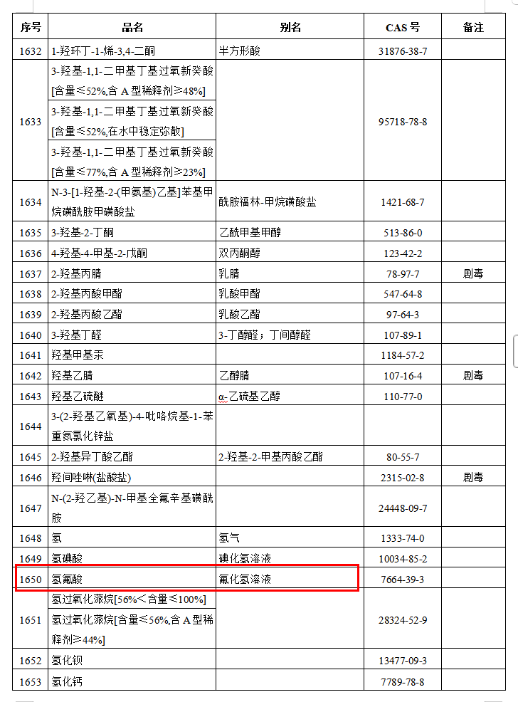 在《危险化学品目录》(2015版)中,记者查询到“1650号”即为“氢氟酸”。