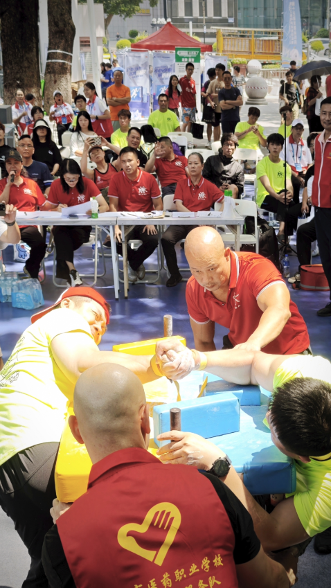 2025年8月8日广州天河体育中心,为迎接即将举办的全运会,广州开展市民体育健身活动,掰手腕比赛是其中的活动项目之一。
