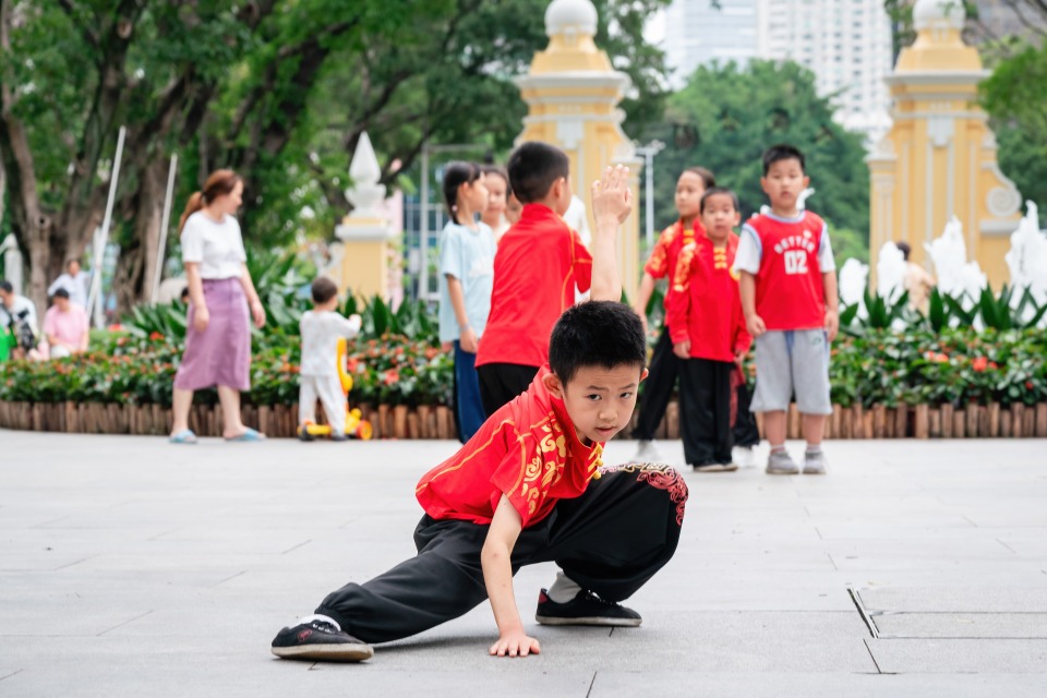 在人民公园里,小小少年在练习武术,眼神无比坚定。