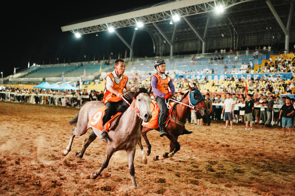 在黔南的三都水族自治县竟然隐藏了一个巨大的国标标准赛马场,每逢周末就有村际赛马比赛,免费入场观看。近距离看骏马冲出起点,马蹄翻飞带起尘土。骑手俯身握缰,人与马默契配合,冲刺、反超不断,观众欢呼震天,气氛沸腾。