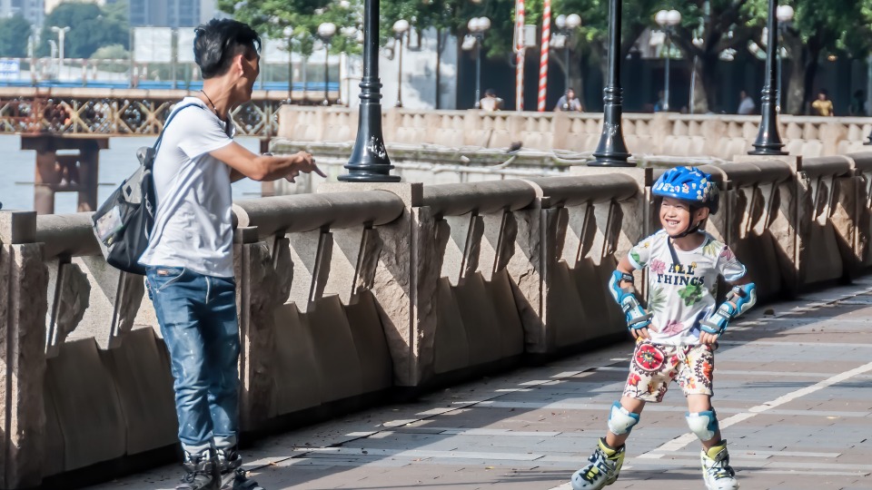 亲子踩着轮滑在阳光明媚的珠江边,父亲转身与孩子 互动,画面是如此的温馨。