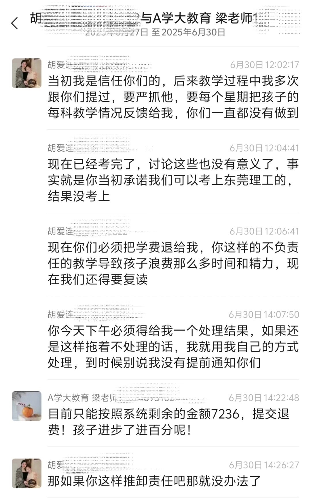 “报的是一对二的课程,因为你们的原因上的一对三,你承诺我说可以考进东莞理工的,现在没有达到要求,这是你们的原因导致孩子搞成这样,你们必须全额退款给我,假如不是你这样承诺的话,我是不可能在你这里报名交那么多费用的。”