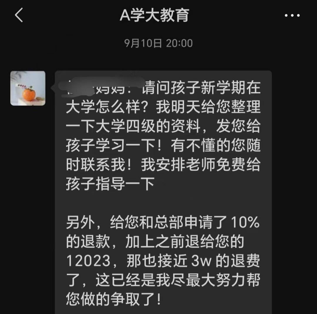 此前,她们在微信上也跟学大教育(莞城校区)负责处理此事的梁老师多次沟通,但学大教育方面始终表示,“没有办法退款”。