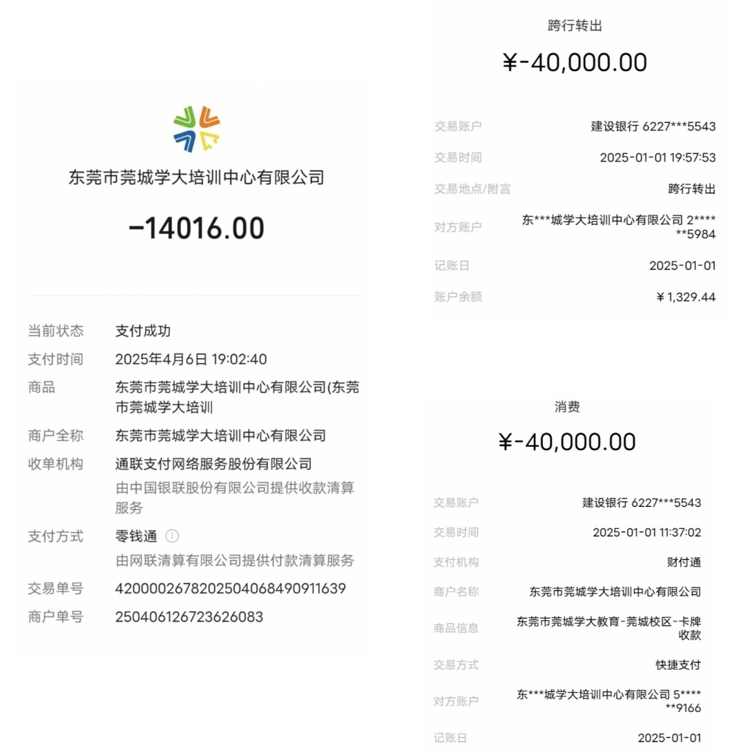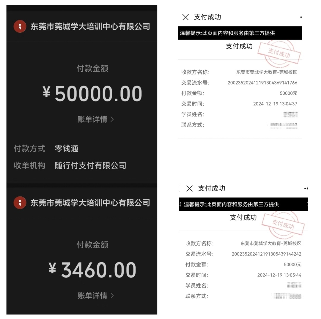 为此,小郝的妈妈分三次向学大教育方面共支付了15.346万元,小马的妈妈则分三次共支付了9.4016万元。除此之外,她们还在学大教育(莞城校区)附近租房子,付工资请人照顾孩子,花费巨大。