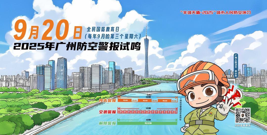 经广州市人民政府批准,广州市将于9月20日(星期六,全民国防教育日)上午举行全市防空警报试鸣暨“羊城天盾-2025”城市人民防空演习。