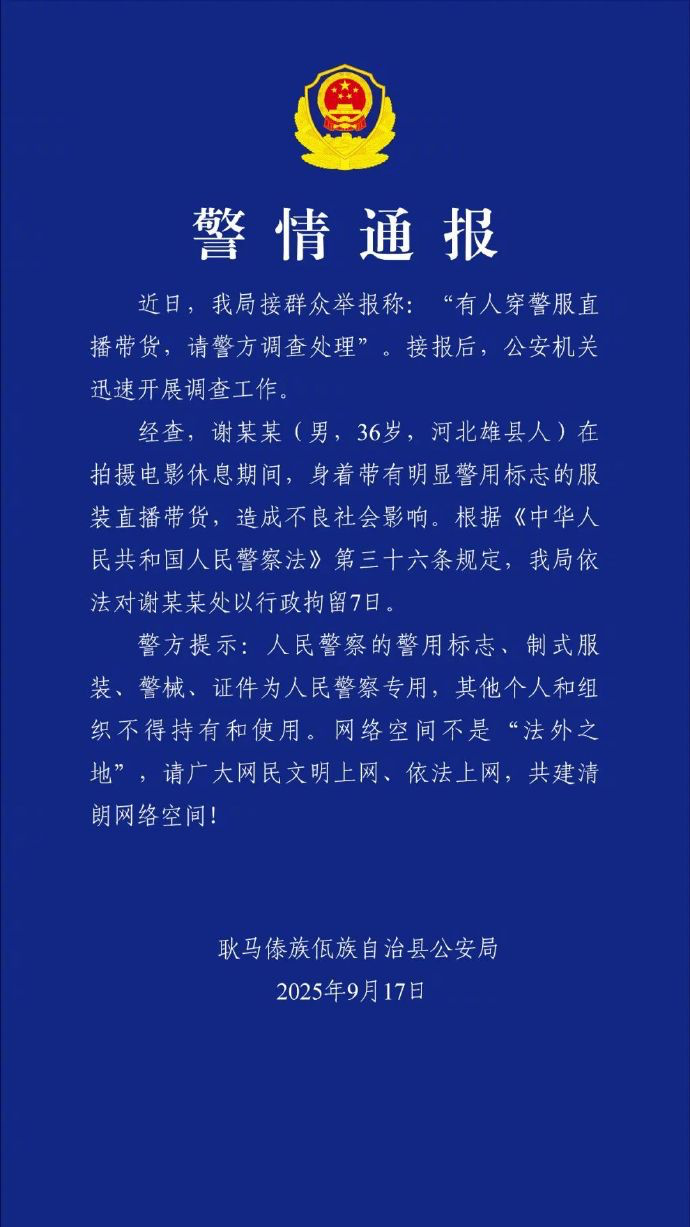 经查,谢某某(男,36岁,河北雄县人)在拍摄电影休息期间,身着带有明显警用标志的服装直播带货,造成不良社会影响。根据《中华人民共和国人民警察法》第三十六条规定,依法对谢某某处以行政拘留7日。