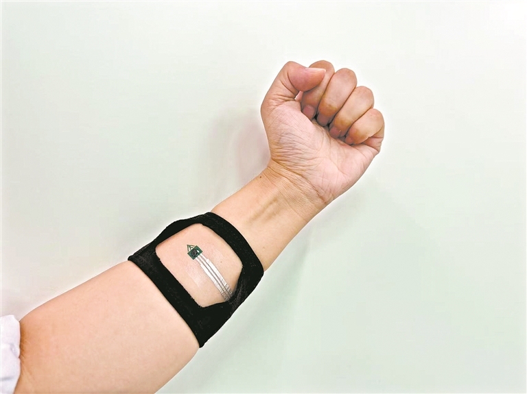 近日,香港科技大学(广州)功能枢纽先进材料学域主任、教授高平向记者展示了一款智能皮肤贴片汗液传感器。这款传感器由纳米薄膜和电路构成,可以贴敷在皮肤上,让汗液通过透气、多孔纳米膜,监测汗液中的乳酸值等数据。这些监测数据可直接发送到手机上,用于反映人体在运动时的身体健康状况、运动强度和身体疲劳度。“在此之前,大家要想知道这类数据,只能通过抽血化验。我们这款传感器则突破了这一限制。依靠我们研发的纳米材料,能直接对汗液进行微量分析。”高平说。