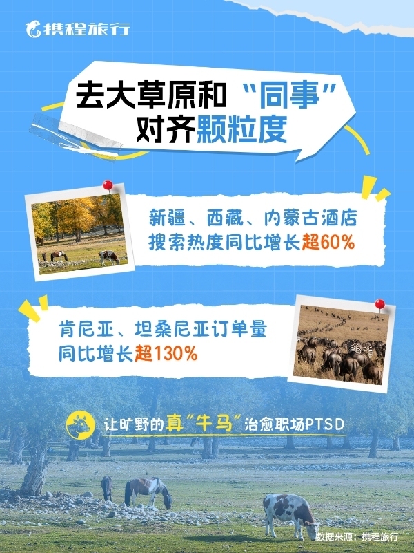 情绪价值正成为旅客选择目的地的核心因素,“打卡式旅游”逐步让位于“沉浸式度假”。携程平台上,新疆、西藏、内蒙古等远途目的地酒店搜索热度同比上升60%,且客源多来自一线和新一线城市。广袤草原与独特风光自然形成的心灵疗愈场景,正呼应了这些城市里的“工位主理人”想要放松身心、回归自然的内在需求。