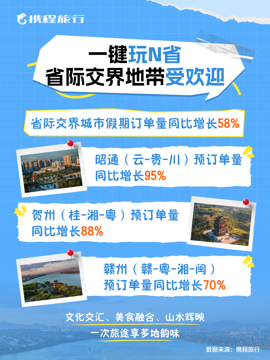 在宝贵的假期,旅客非常重视时间利用效率,能够一次性体验多个省份风情的省际交界城市,成为今年国庆的热门选择。携程数据显示,截至目前,国内省际交界城市的假期订单量同比增长58%。其中,融合了云、贵、川三省民族风情与自然景观的昭通假期预订单量同比增长95%;处于桂、湘、粤交界的贺州以喀斯特地貌与古镇文化闻名,订单量同比已增长88%;位于赣、粤、湘、闽四省交界的赣州订单量同比增长70%,其客家文化与红色历史吸引大量游客。