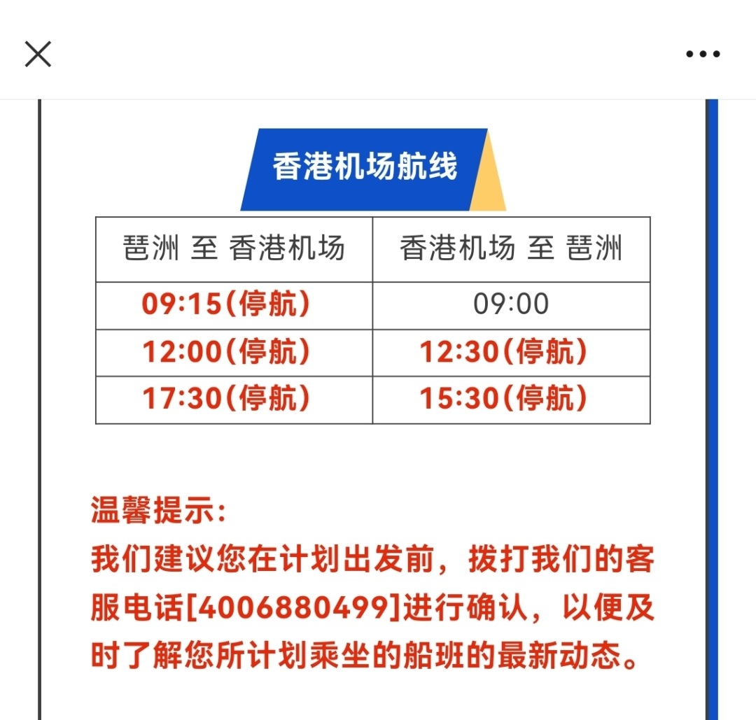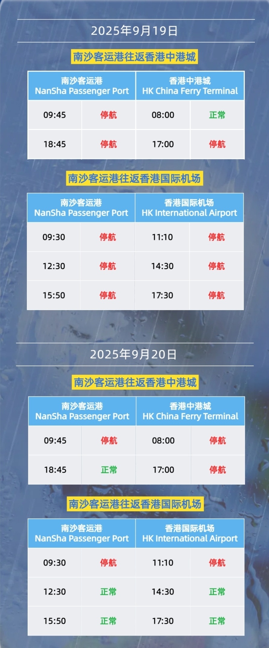 截至目前,广州海事局辖区海上风电施工平台人员已全部撤离。9月19日至20日南沙客运港往返香港中港城航线、香港国际机场航线部分航班暂停营运,9月19日琶洲港澳口岸往返香港机场航线部分航班暂停营运。
