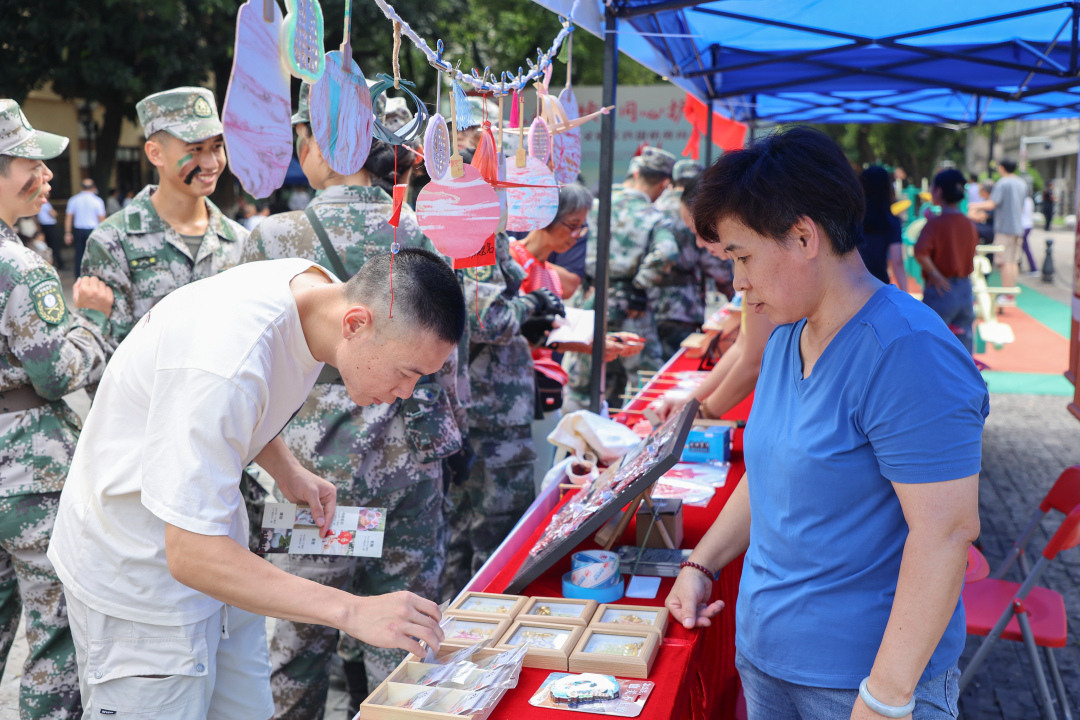 一旁,荔湾区国防教育游园会设置六大主题互动摊位,涵盖红色历史学习、国防知识科普、军人风采感受、榜样力量传递等多个维度,让市民群众在趣味互动中学习国防知识、感受红色精神。