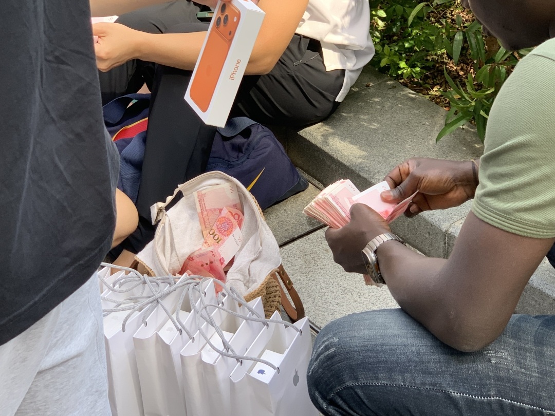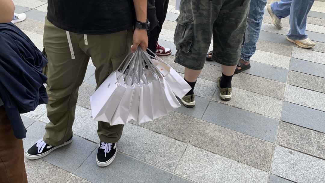 9月19日,苹果iPhone17系列正式开售。广州日报新花城记者在广州天环苹果专卖店门外观察到,今早9时已经有逾百人排队等候。门外“黄牛”炒卖依然活跃,有人用旅行袋装载大叠现金在现场交易,遭保安人员驱赶。