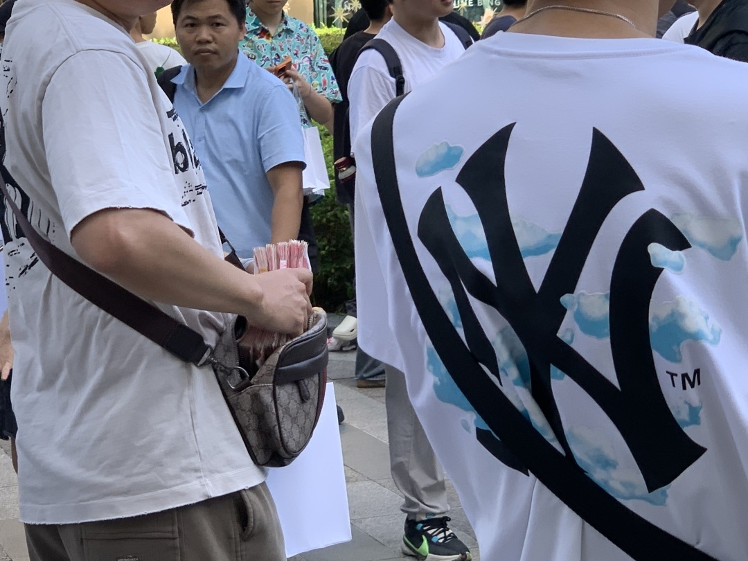 店外有数十名“黄牛”以溢价500元-800元回收新机,然后以700元至2000元不等的价格转卖。有人提货后,直接扎堆“黄牛”,转卖手中新机。有人带着大叠现金回收和转卖新机,买卖双方在现场数钱,很快就被保安人员驱离现场。有“黄牛”更是举着纸牌吸引注意,以更多回收新机。