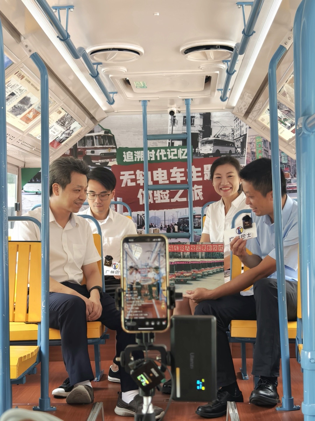 活动当天,一辆编号为D-62234的复古电车化身“移动宣传阵地”——墨绿色的车身泛着温润光泽,木质扶手、黄铜拉环承载着老广州的公交记忆。由广州巴士集团资深巴士迷司徒颖、营运管理员罗毅鉴组成的直播团队,携手车辆技术专家何满强和广州电车爱好者汤晓明开启沉浸式云端直播。