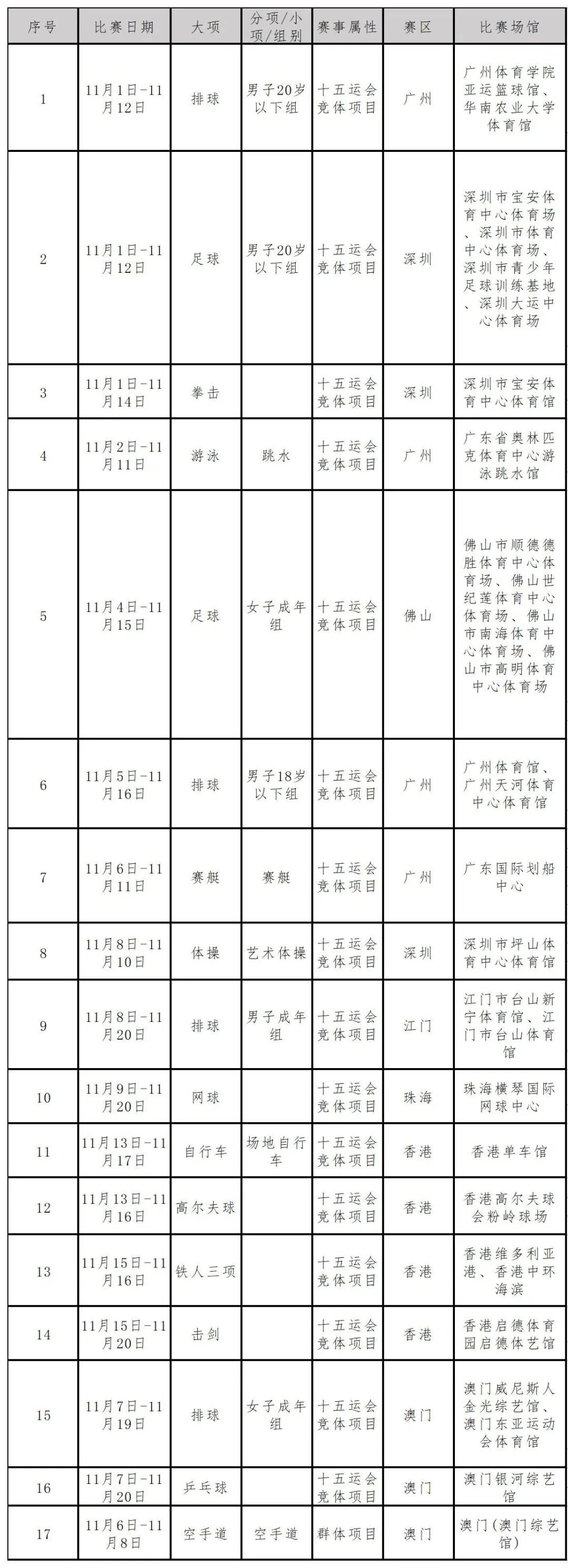 此外,澳门赛区比赛门票首次面向公众开售。排球(女子成年组)、空手道和乒乓球三大项目将分别在澳门标志性的场馆激情上演,将为十五运会增添别样的风采,促进粤港澳大湾区体育文化的深度交流与融合发展。