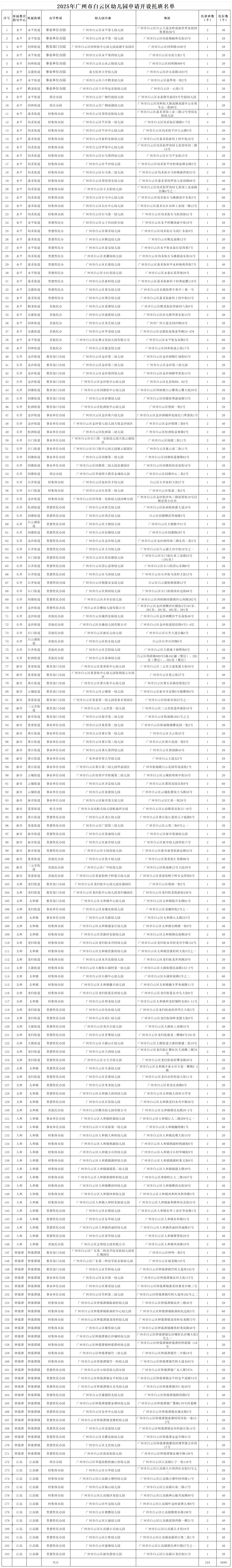 通知指出,根据《广州市人民政府办公厅关于广州市3岁以下婴幼儿照护服务体系建设三年行动计划(2023-2025年)的通知》(穗府办〔2024〕3号)、《广州市白云区3岁以下婴幼儿托育服务工作联席会议办公室关于印发白云区3岁以下婴幼儿照护服务体系建设两年行动计划(2024—2025年)的通知》精神,对照《广州市幼儿园开设托班工作指引(试行)》要求,经幼儿园申请,白云区教育局组织各教育指导中心进行材料审查和现场查看,并报送白云区卫生健康局审查,同意广州白云区永平第七幼儿园等183所幼儿园开设托班,有效期为一学年(2025学年秋季、2025学年春季),入托年龄为2-3岁,班额上限为20人/班。请各幼儿园严格按照核定规模进行招生办学,配齐配足保教人员。凡不在本名单中的幼儿园,均无开设托班资质。