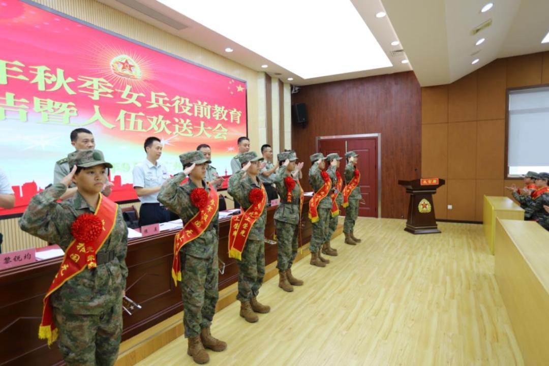 近日,广州市2025年秋季女兵役前教育总结暨入伍欢送大会在广东省军区综合训练队举行。约50名优秀女青年身着崭新军装,肩披“参军报国、无上荣光”绶带,胸戴鲜艳红花,英姿飒爽、整装待发,陆续踏上强军兴军的新征程。