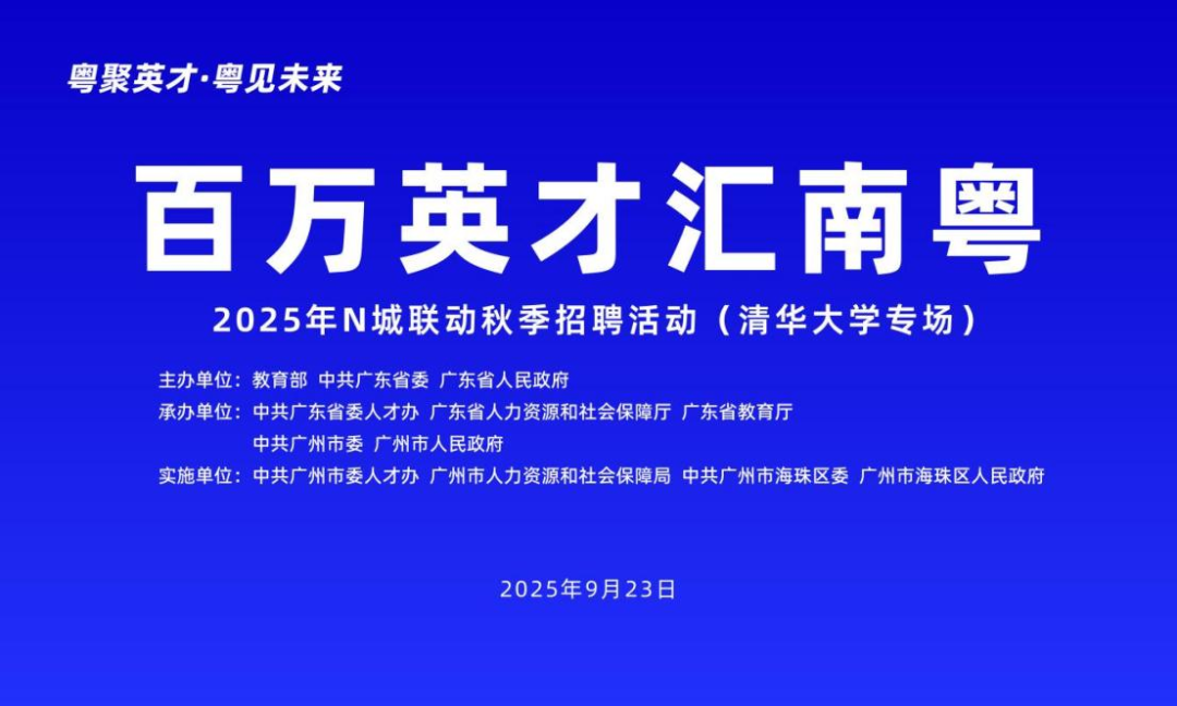 为搭建高校学子与优质用人单位的对接桥梁,助力优秀人才扎根粤港澳大湾区发展,“百万英才汇南粤”2025年N城联动秋季招聘活动(清华大学专场)将于9月23日上午在清华大学祖龙广场、华为多功能厅开展。