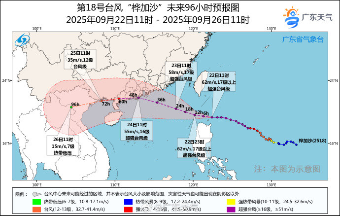 9月22日11时,今年第18号台风“桦加沙”(超强台风级)中心位于北纬19点3度,东经122点4度,也就是在距离东沙岛东偏南方向约590公里的洋面上,中心附近最大风力17级,达到62米/秒的风速,中心最低气压910百帕。预计,“桦加沙”将以每小时20公里左右的速度向偏西方向移动,强度变化不大。