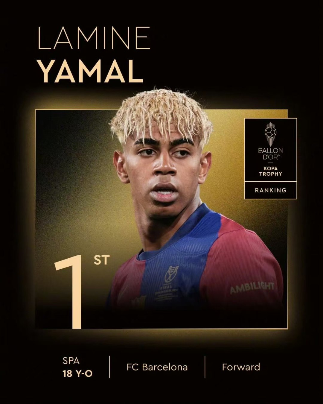 此外,在本次金球奖中排名第二的是巴萨的西班牙天才球员亚马尔,他也蝉联科帕奖(最佳年轻球员),18岁零17天的亚马尔也成为了首位连续两次获得该奖项的球员,也是历史上进入金球奖排名前三的最年轻的球员。而亚马尔的父亲穆尼尔则在接受采访中坚定地表示:“2026金球奖是属于我儿子的”。值得一提的是,巴萨的球员近5年四次夺得科帕奖,其中亚马尔2次,加维和佩德里各一次,这也让人对巴萨的未来非常期待。