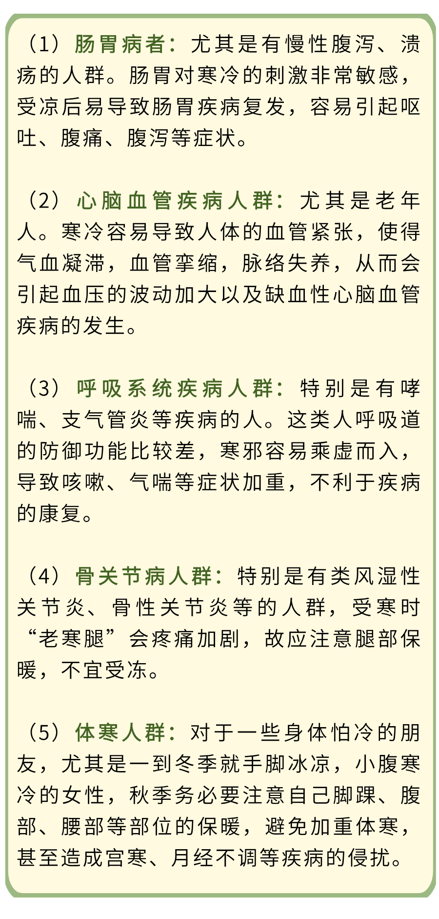 不过,并非所有人都适合“薄衣御寒”,有胃肠疾病者、心脑血管疾病人群、呼吸系统疾病人群、骨关节病人群还有体寒者等五类人群秋分过后,应注意保暖,否则容易疾病复发、加重,甚至可能发生急性机体意外。