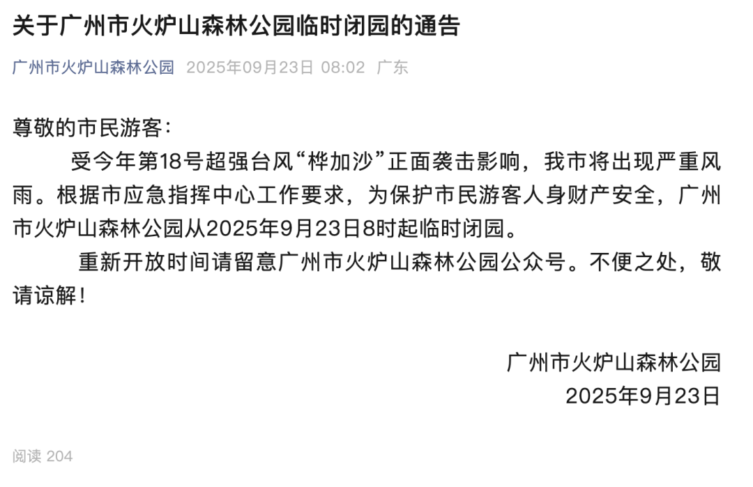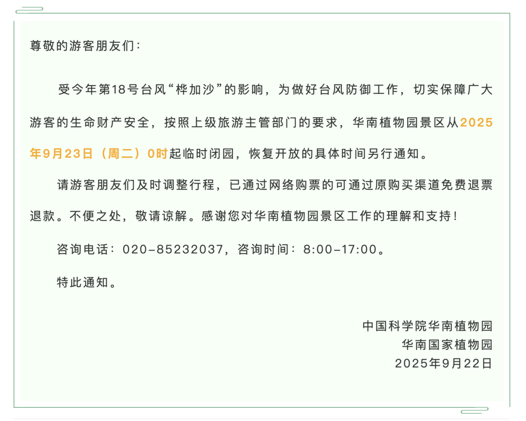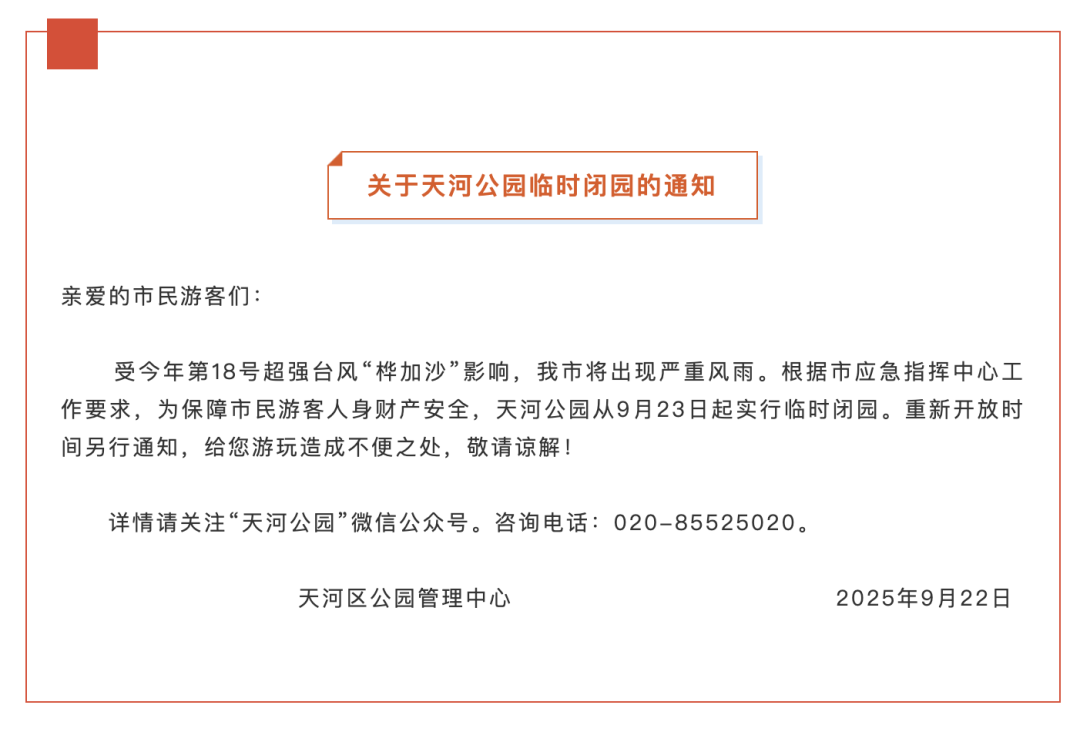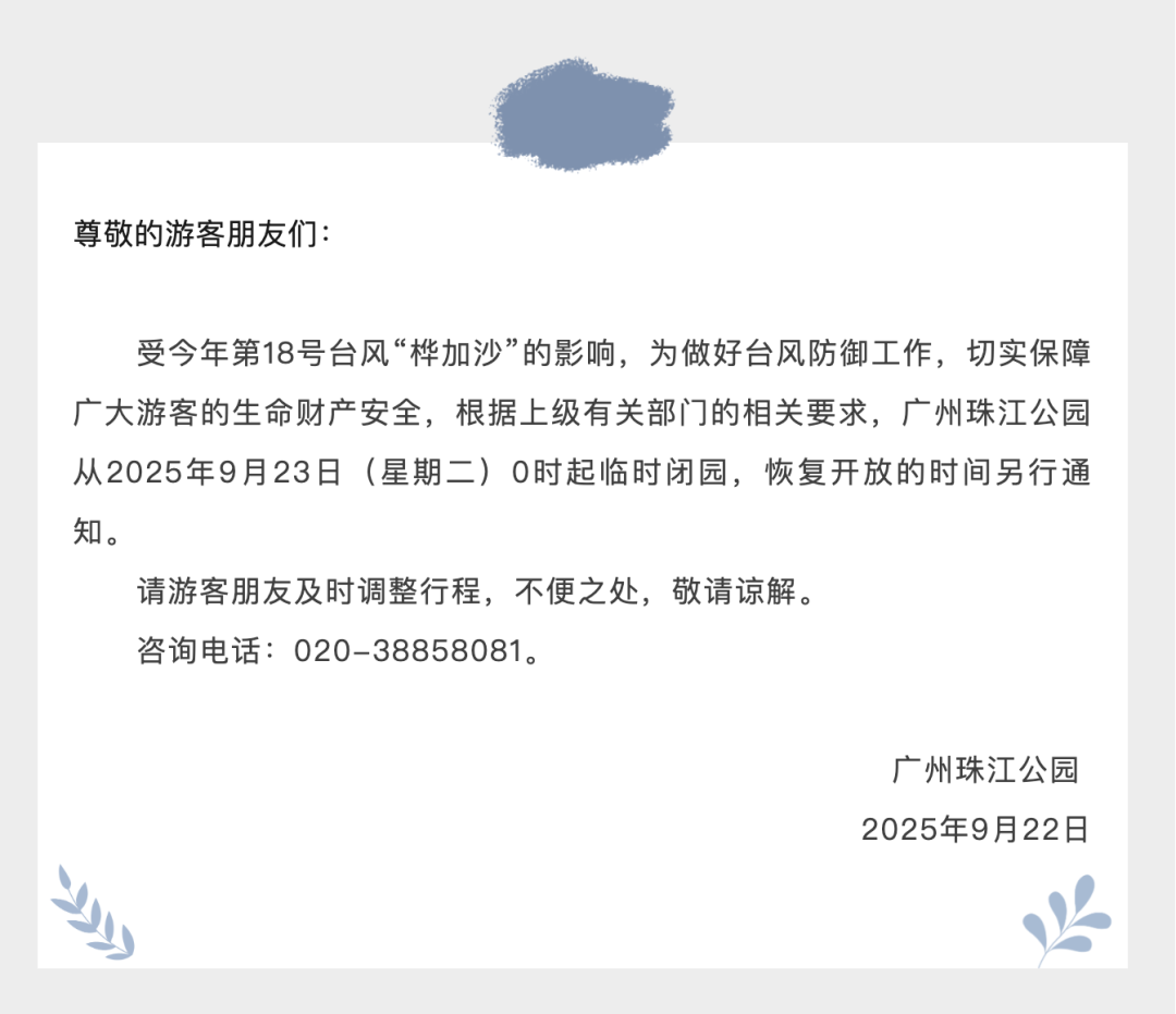 受到今年第18号台风“桦加沙”影响,多个位于广州天河区的景区从本月23日起临时闭园,恢复时间将另行通知。