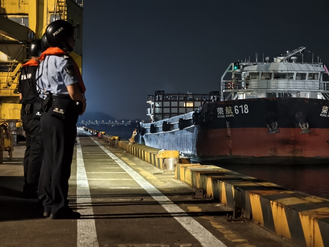 受台风天气影响,9月23日凌晨,“荣航618”和“悦江98”号集装箱船从香港入境顺德北滘港码头,顺德边检站为船舶紧急办理边检手续