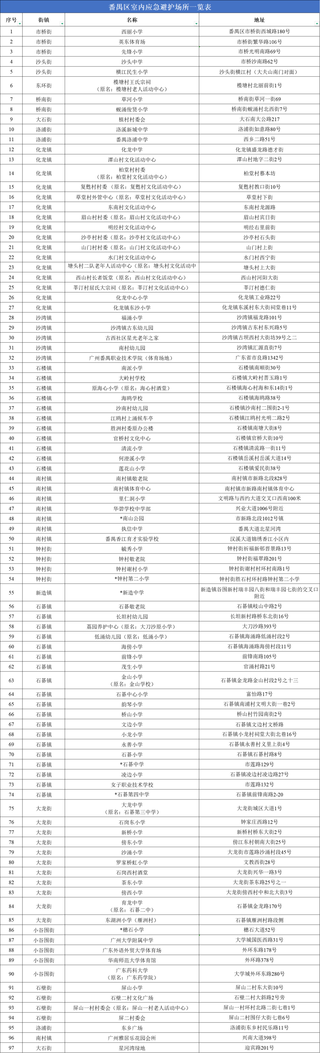 “桦加沙”强度极强、风圈范围大,具有极端性,请务必做好防御,安全第一!以下为番禺区应急集中安置点: