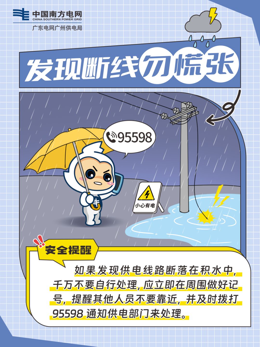 ○ 如遇供电线路断落、供电设备浸水等险情请勿靠近(保持10米以上安全距离),第一时间拨打供电24小时抢修服务热线95598反馈,同时提醒周边人员避让,确保自身及他人安全。