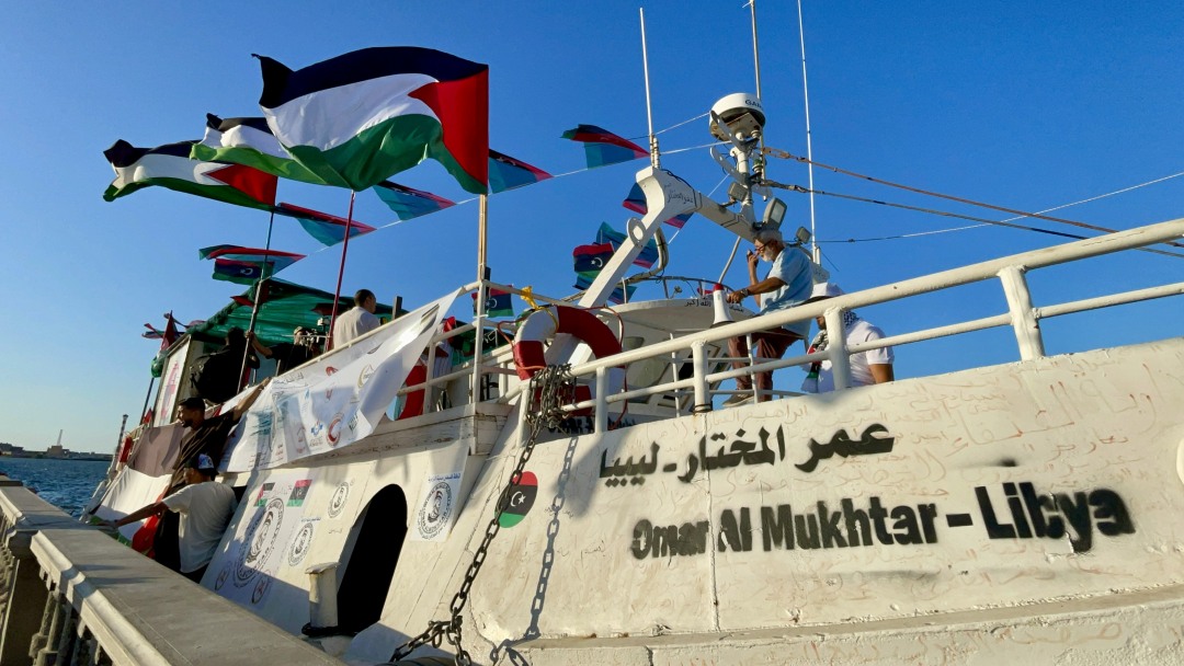 9月21日,在利比亚的黎波里,一艘向加沙运送人道主义救援物资的船只准备启航。新华社发(哈姆扎·图尔基亚摄)
