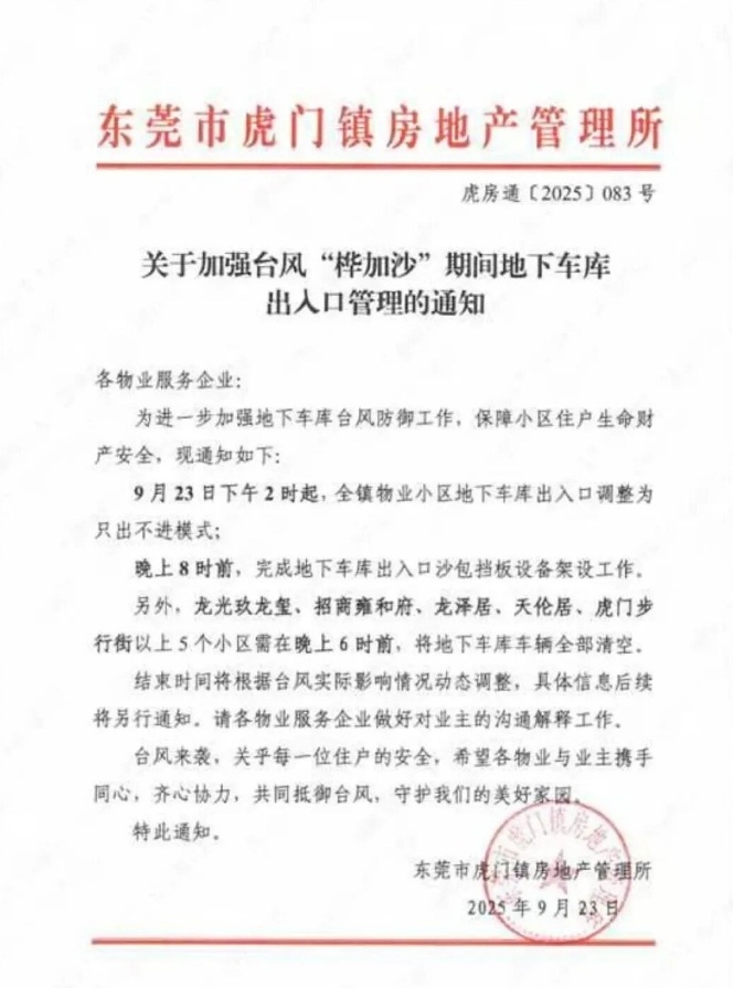 9月23日下午2时起,虎门全镇物业小区地下车库出入口调整为只出不进模式。晚上8时前,完成地下车库出入口沙包挡板设备架设工作。龙光玖龙玺、招商雍和府、龙泽居、天伦居、虎门步行街以上5个小区须在晚上6时前,将地下车库车辆全部清空。