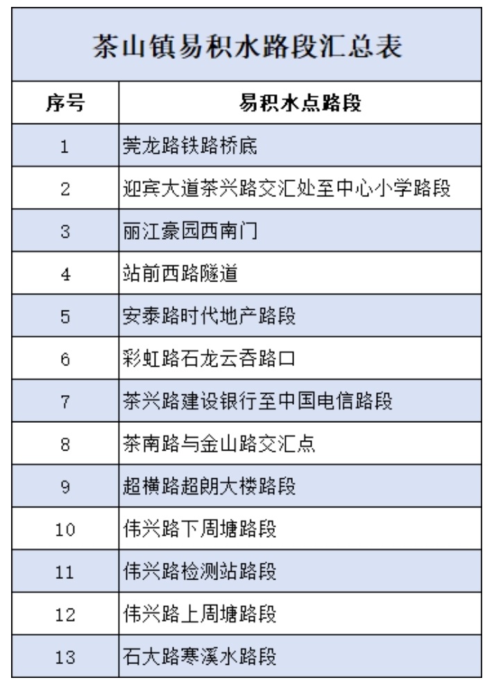 除上述两个路段实施临时交通管制外,茶山发布整理出以下易积水点,请茶山市民不要把车停在树下或低洼地区,避免造成财产损失!