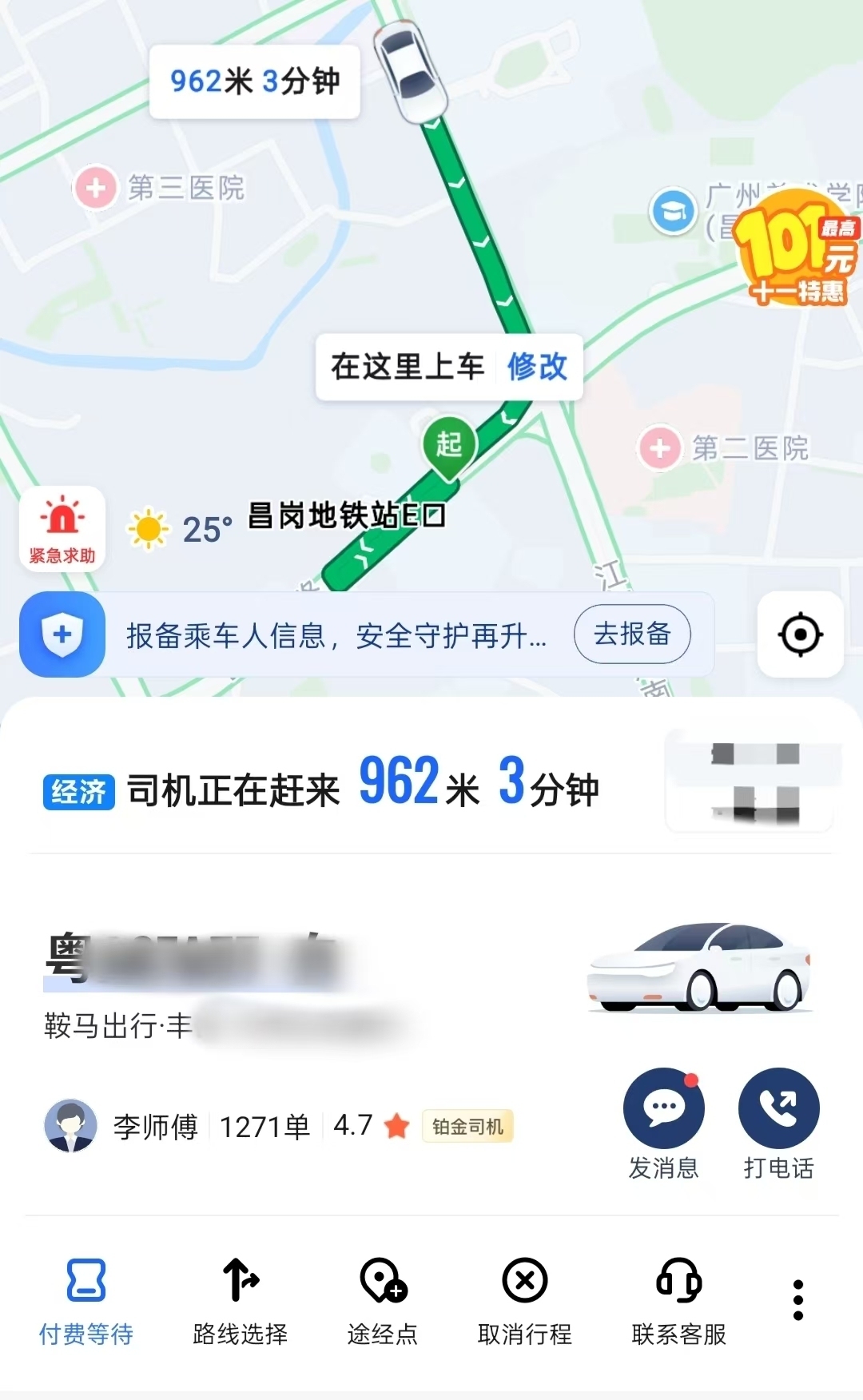 9月24日18时03分,记者在广州海珠区通过网约车平台发起叫车,当前可正常下单,但系统提示“附近叫车难请耐心等待”;18时05分,系统显示已有司机接单,正前往接驾。