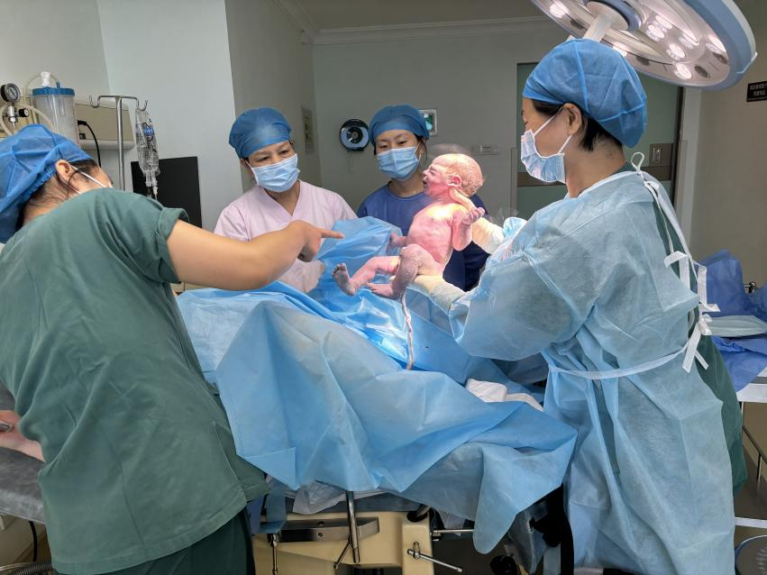 在广东祈福医院产科,产科主任隋珍带领团队一早便高效完成5台剖宫产手术。其中一位30岁的二胎孕妇合并高血压、糖尿病、肥胖症及B族链球菌感染等多种高危因素,经团队周密评估与协同操作,母婴状态平稳,手术过程顺利。