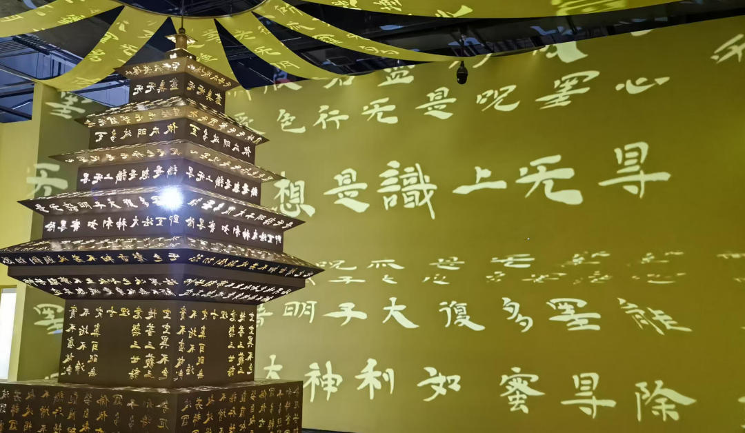 据介绍,五大展区依塔之结构展开:“浮图”以光影装置《映心》将经文化作可环绕行走的经塔;“塔林”艺术家用镜头记录了80多座佛塔的沧桑身影;“天宫”以无人机视角重塑登临体验;“地宫”聚焦供养仪轨,结合文学与书法作品;尾声“世界之轴”则通过AI数字技术延伸至虚实交织的元宇宙。展览同时发布特制字体“汉仪敦煌当代隶楷”,融合古籍风格与当代设计,呼应主题中的书写传统与创新表达。