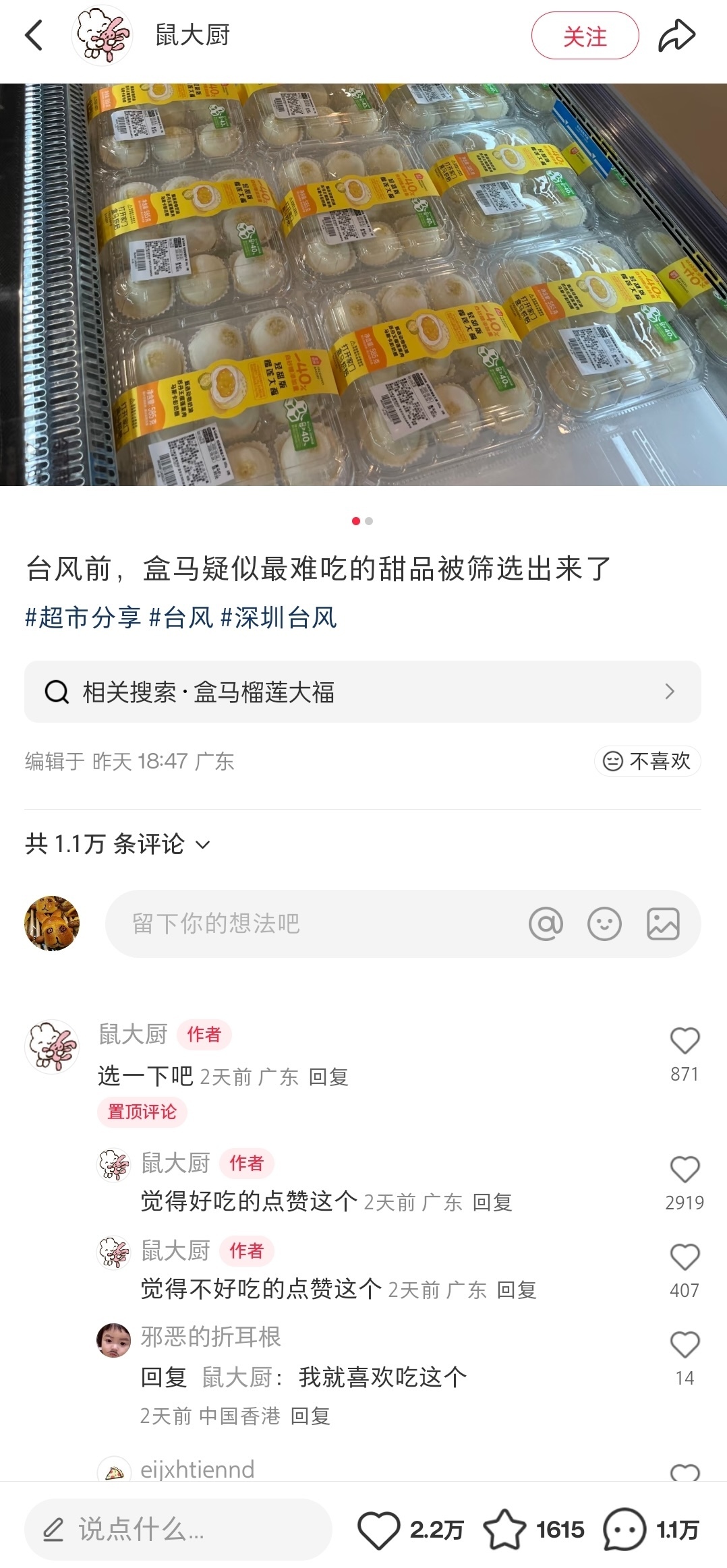 有趣的是,热搜之下,网友的反馈却呈现“一边倒”。在小红书热帖评论区中,9成网友为榴莲大福发声,称“榴莲控表示超爱”“吃过的都说香”;热搜讨论区里,还有认为盒马等知名商超的烘焙系列极少让人失望,这款榴莲大福“显眼包”被剩下 ,只是因为它不是应急食材而已。