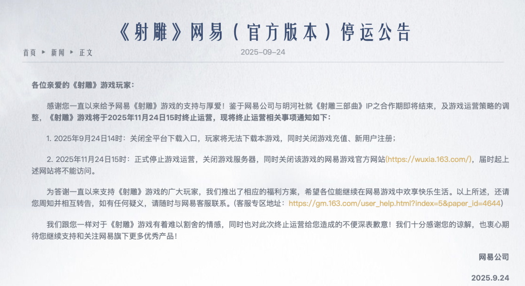 9月24日,网易发布公告称,鉴于网易公司与明河社就《射雕三部曲》IP合作期即将结束,及游戏运营策略的调整,《射雕》游戏将于2025年11月24日15时终止运营。网易在公告中表示,“我们跟您一样对于《射雕》游戏有着难以割舍的情感,同时也对此次终止运营给您造成的不便深表歉意!”
