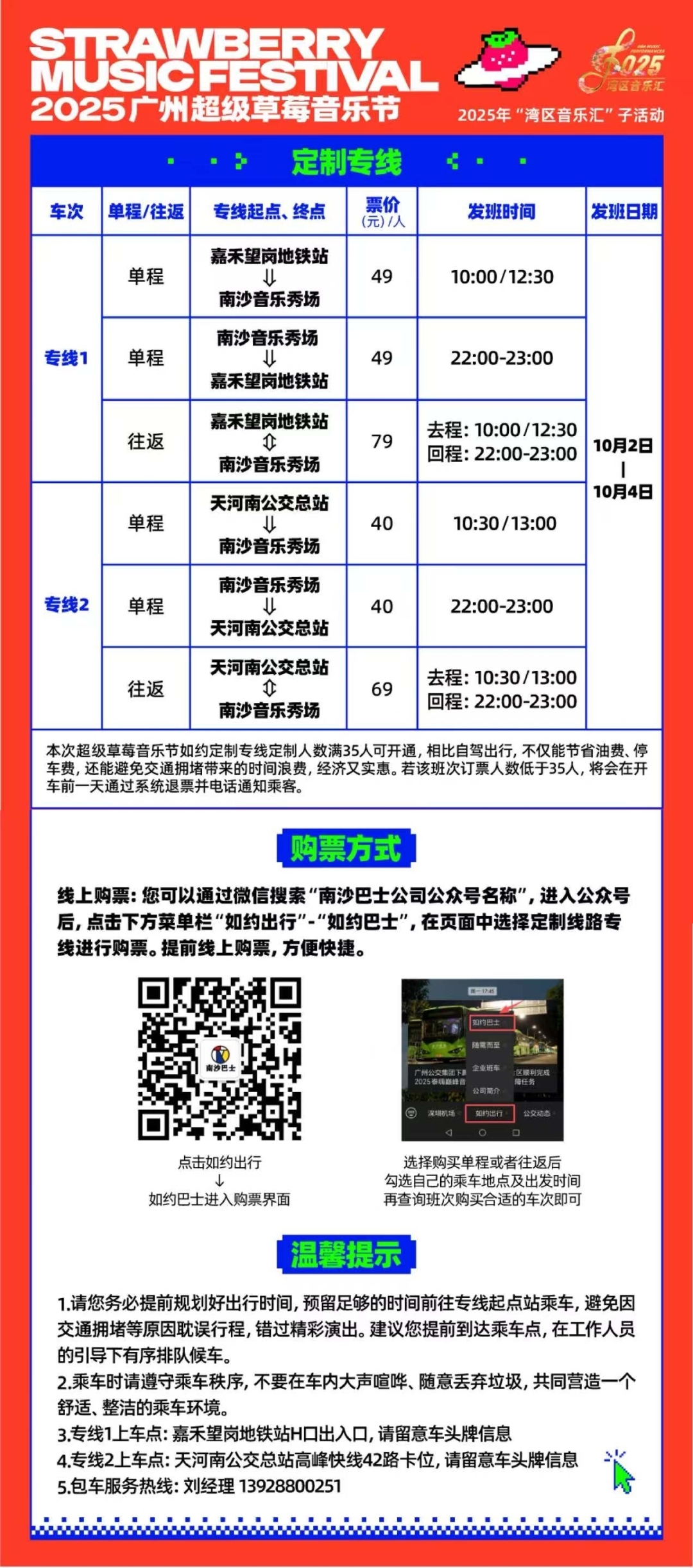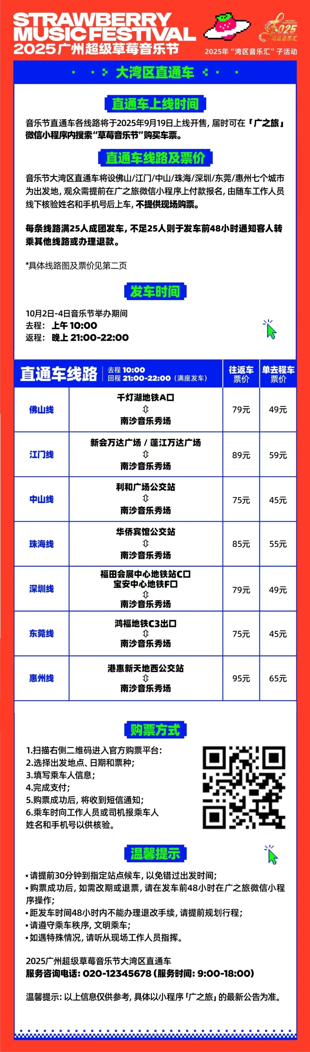 与此同时,还有广之旅提供的大湾区跨市往返直通车、南沙巴士提供的市区往返定制专线、草莓音乐节官方提供的地铁站免费接驳车,官方也协调了音乐节周边多个停车场供自驾乐迷停车,真正让乐迷出行无忧。