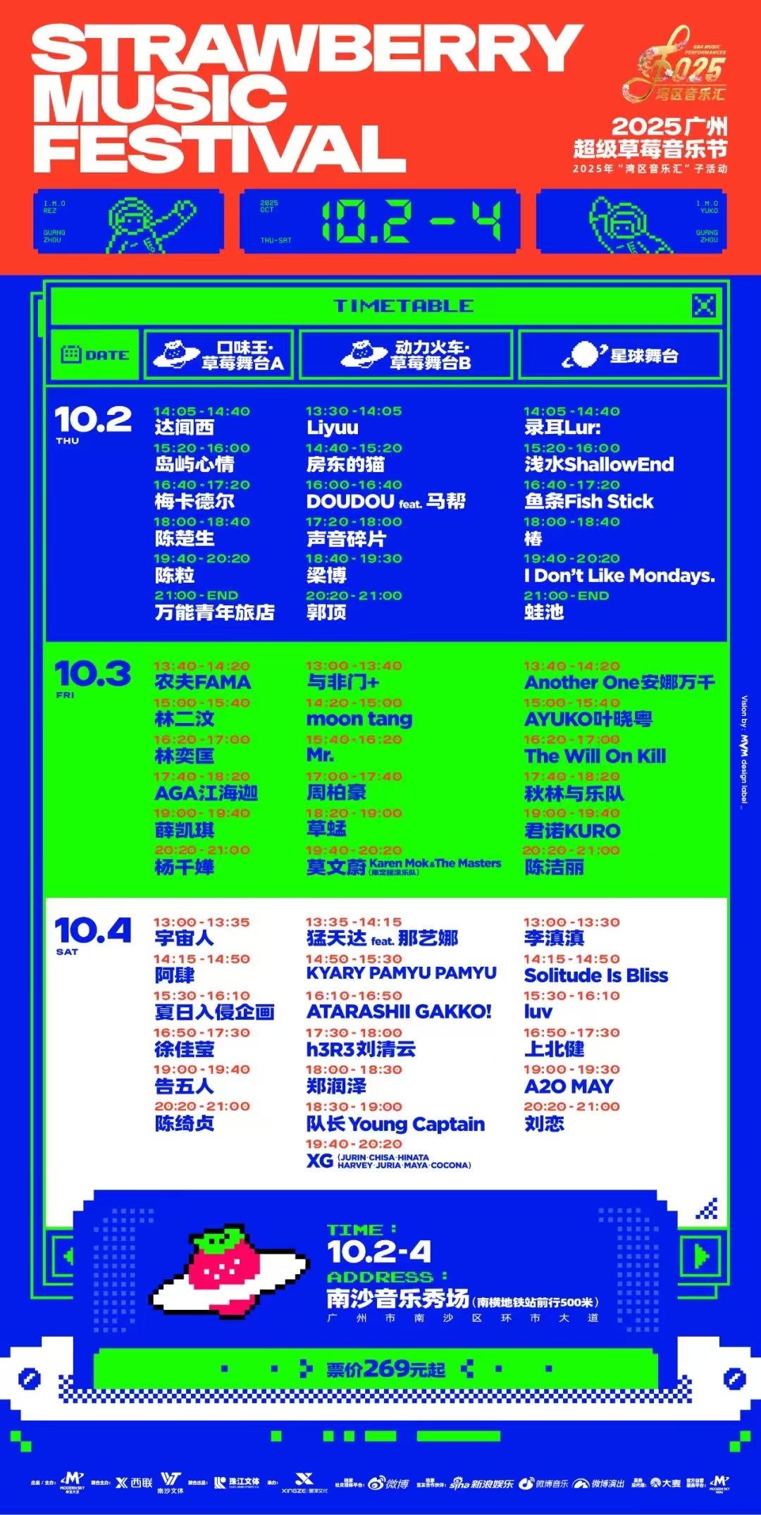 10月3日粤语日特别企划,聚焦粤语音乐力量,呈现经典与新声的对话:莫文蔚领衔限定摇滚乐队 Karen Mok & The Masters 首演草莓音乐节,薛凯琪、林奕匡、moon tang、草蜢等港乐唱作人集结,杨千嬅、林二汶、农夫FAMA、AGA、与非门+重温“港乐黄金年代”;「自在观」音乐厂牌特别策划星球舞台,带来秋林与乐队、Another One 安娜万千、AYUKO叶晓粤、君诺KURO、陈洁丽、The Will On Kill 等湾区原创力量。