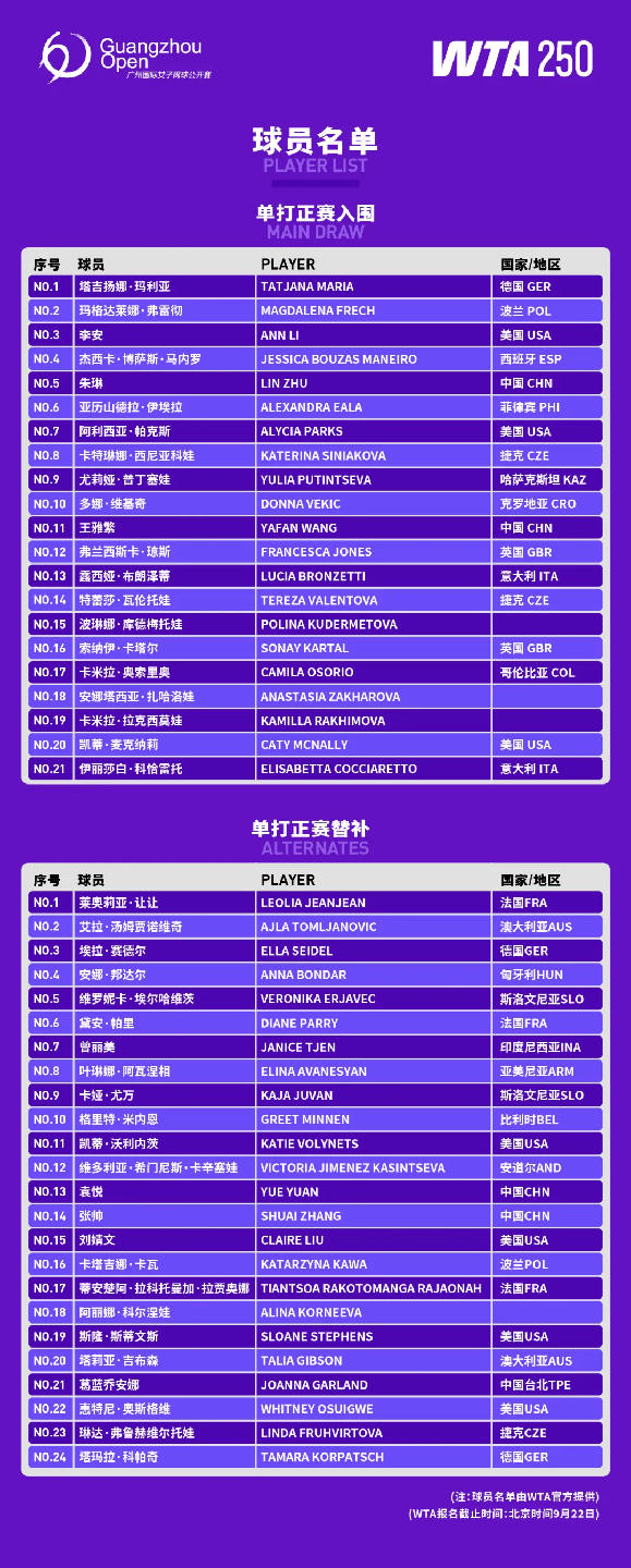 中国选手方面,曾打进过大满贯第四轮、拿到过WTA单打冠军的朱琳、王雅繁都把珍贵的“排名保护”资格留给了广网。过去两年她们因为伤病遗憾缺席,今年复出后希望能把最好的表现带给广州球迷。此外,袁悦、张帅、王曦雨、韦思佳、郭涵煜等也都在替补名单中,有望亮相今年广网。