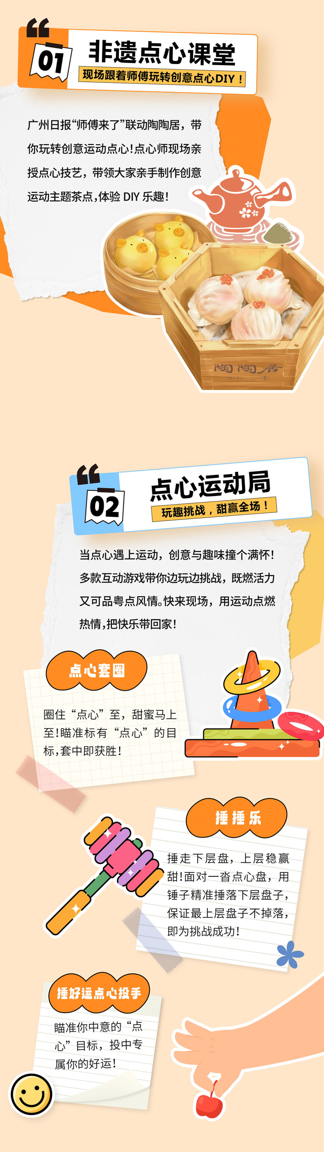 想亲手制作独一无二的创意点心吗?广州日报“师傅来了”栏目联合陶陶居,在活动现场打造“点心课堂”。经验丰富的点心师傅将现场教学,带领大家共同制作创意茶点。快快来报名吧,名额有限,先到先得哦!现场还有惊喜礼物领哦!