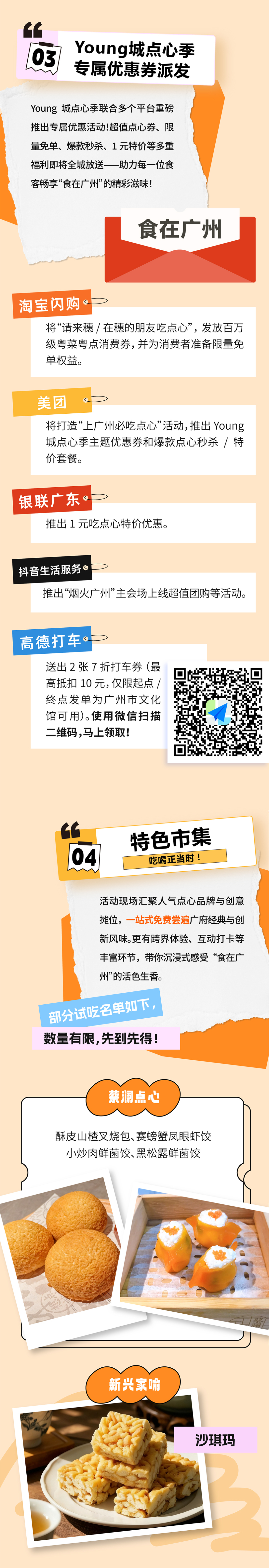 现场,多重优惠全城放送,畅享“食在广州”好滋味Young城点心季联合淘宝、美团、银联广东、抖音生活服务等平台推出系列惠民活动。届时将发放百万级粤菜粤点消费券,推出爆款点心秒杀、1元特价点心、超值团购等多重福利,助力市民畅享金秋美食消费盛宴。