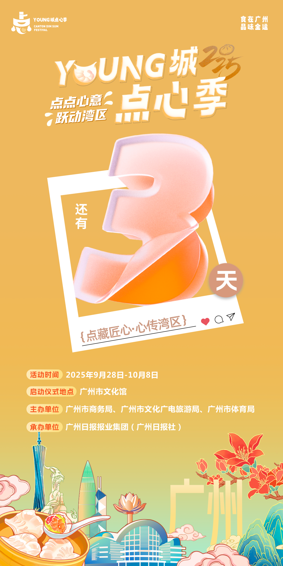 9月28日,一场汇聚广府美食、运动趣味与文化魅力的金秋盛宴将在广州市文化馆拉开帷幕。第二届“Young城点心季”由广州市商务局、广州市文化广电旅游局、广州市体育局联合主办,广州日报报业集团(广州日报社)承办,活动以“点点心意·跃动湾区”为主题,巧妙融合岭南点心文化与十五运体育精神。从9月28日~10月8日,广州将掀起点心热潮,展现广州千年商都的时尚活力与人文温度,为市民游客营造喜庆祥和的节日消费氛围。